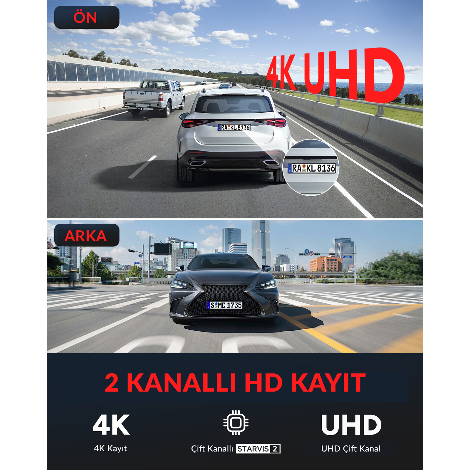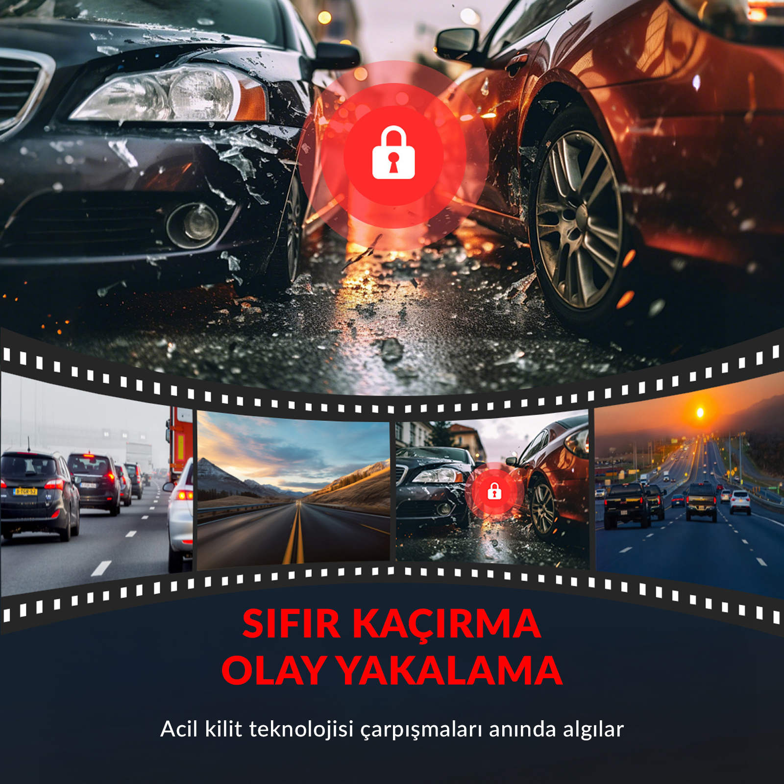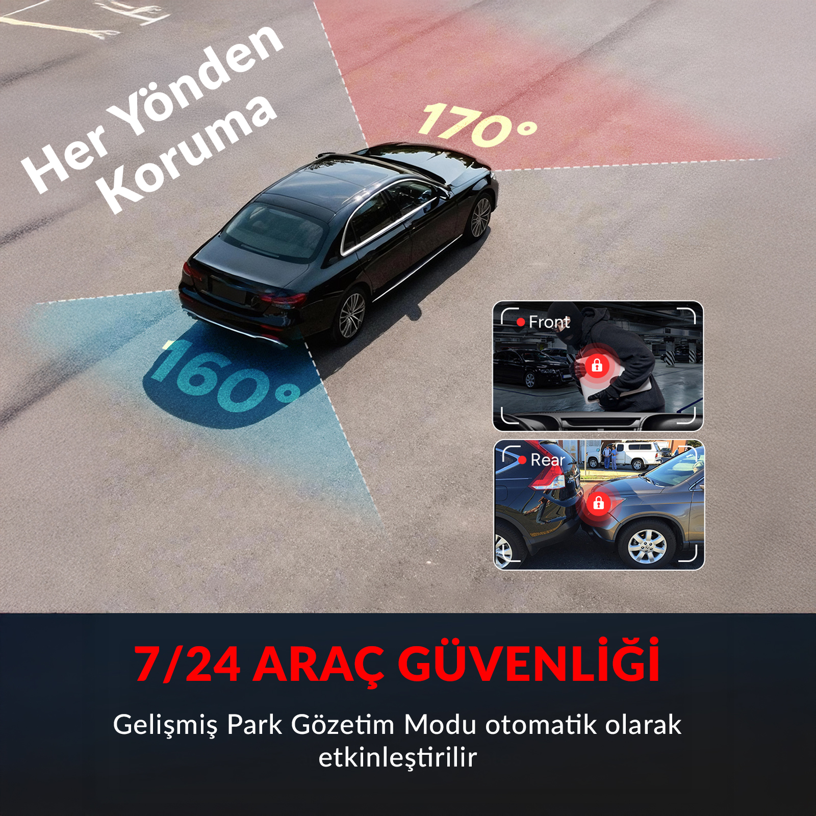 Ön kamera 170° geniş açılı lens ile yolunuzu detaylı şekilde kaydederken, arka kamera 160° lens ile geri görüşü sağlar. Her açıdan güvenli sürüş için eksiksiz çözüm.
