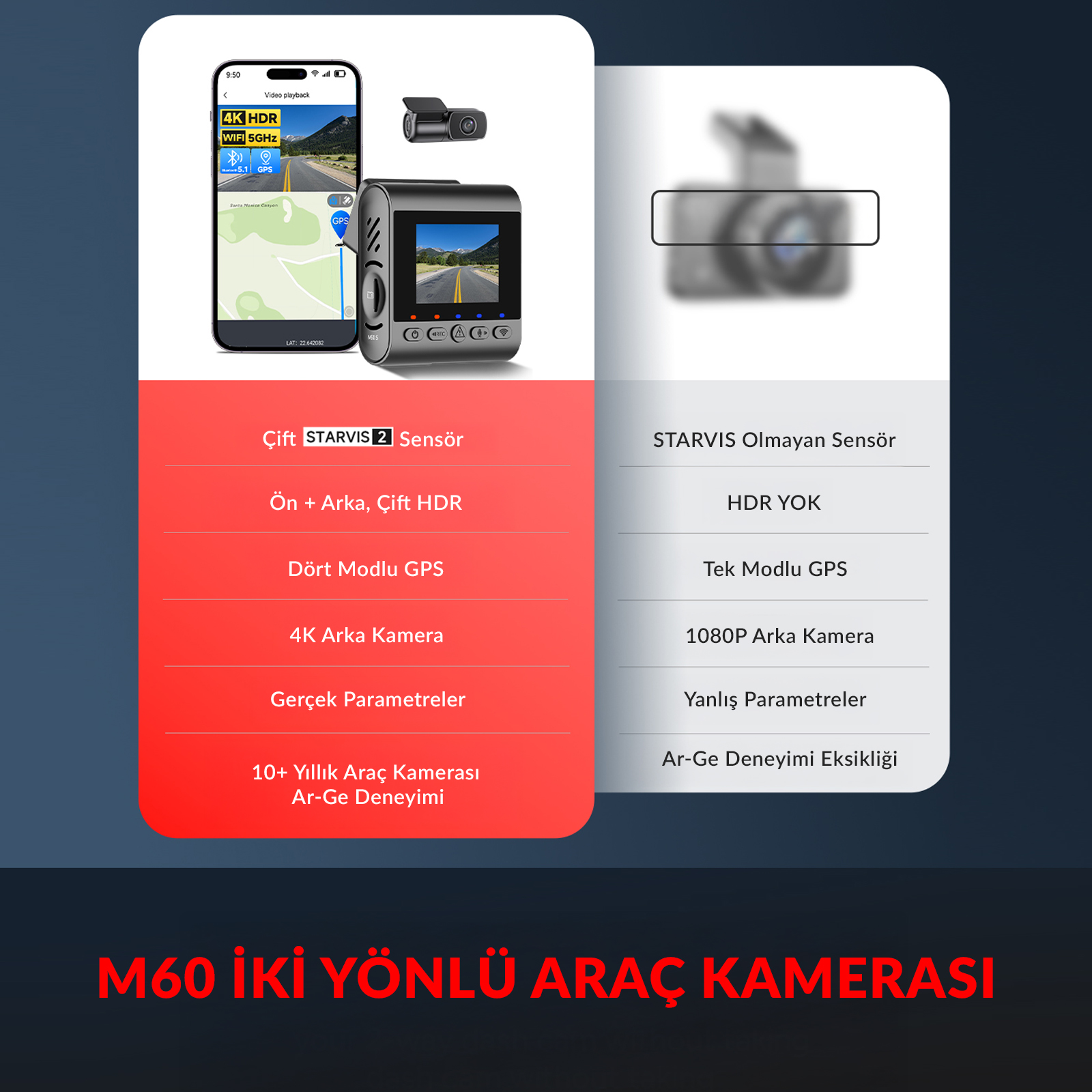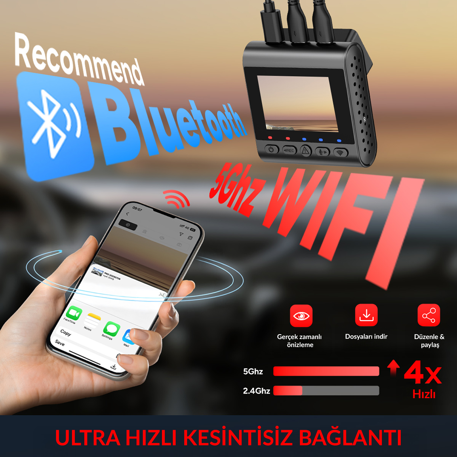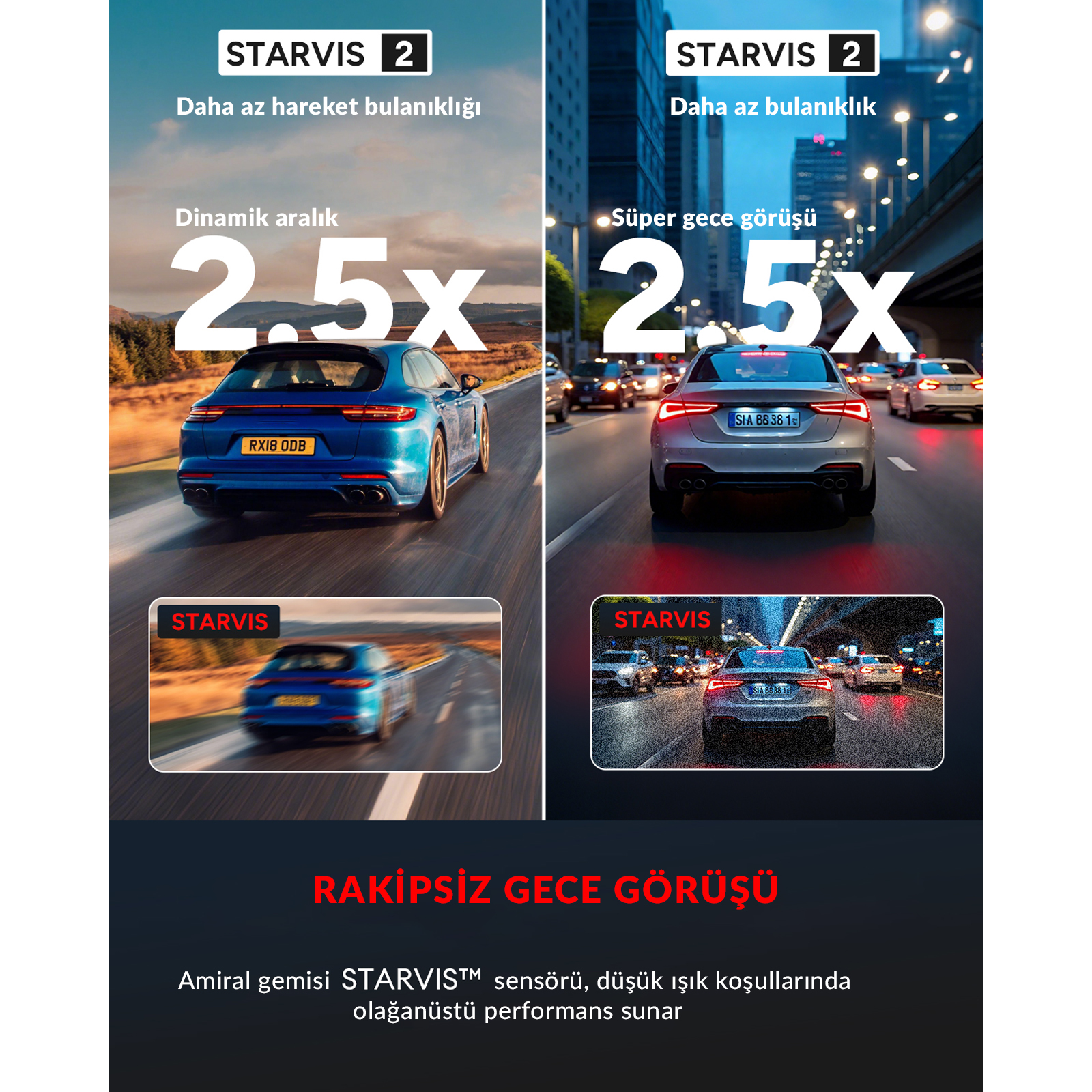 Ön kamera 170° geniş açılı lens ile yolunuzu detaylı şekilde kaydederken, arka kamera 160° lens ile geri görüşü sağlar. Her açıdan güvenli sürüş için eksiksiz çözüm.